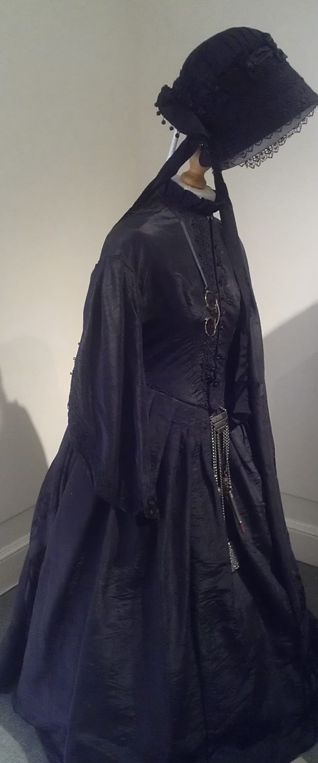 The mourning gown would have been worn along with a mourning cap for indoors or a black bonnet with a veil for outdoors. This bonnet is made of black silk with decorative lace, silk bows and ribbons.