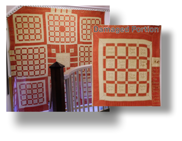 The Museum is raising funds to conserve a beautiful signature quilt that was gifted to the museum in 1988. Measuring 118” x 118”, this sizeable quilt has been on display at the top of the museum’s staircase for the last forty years and through the passage of time, has suffered damage from light, insects and gravity.