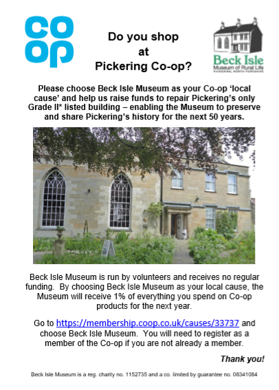 For over 50 years Pickering Beck Isle Museum has been run by volunteers and receives no regular funding from local or national bodies. The Museum has to cover all its costs through admission charges, other earned income and donations from our visitors and supporters. Your support will help to keep the museum open and allow us to conserve items in our collection and develop new displays.